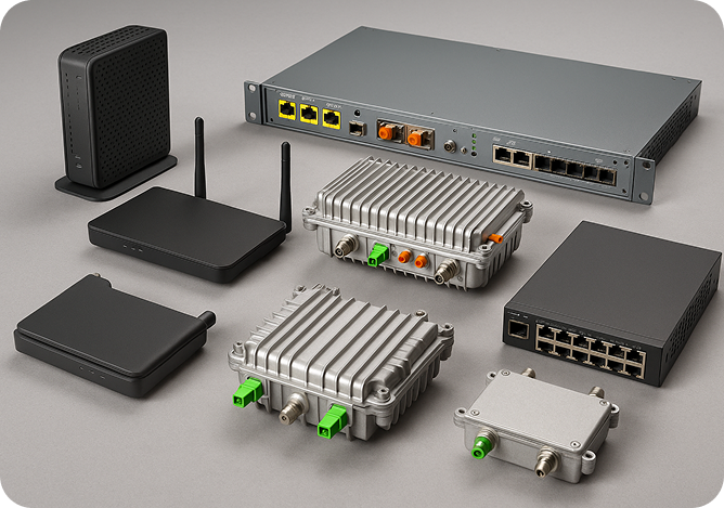 We supply a comprehensive range of active hardware for fiber and hybrid broadband networks — fully stocked and ready for deployment. Our offering covers both modern fiber access and advanced HFC architectures, including segmented and upgrade-ready nodes.